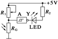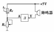 白天,光强度较大,光敏电阻RG电阻值较小,加在斯密特触发器A端的电压较低,则输出端Y输出高电平,发光二极管LED不导通;当天色暗到一定程度时,RG的阻值增大到一定值,斯密特触发器的输入端A电压上升到某个值(1.6 V),输出端Y突然从高电平跳到低电平,则发光二极管LED导通发 光(相当于路灯亮了),这样就达到了使路灯天明熄灭、天暗自动开启的目的. 斯密特触发器是具有特殊功能的非门,即输入低电平将输出高电平;反之,则输出低电平.光敏电阻随着光强度的变化而改变,引起斯密特触发器A端电势的变化. 知识点二、温度报警器 (1)电路如图所示.