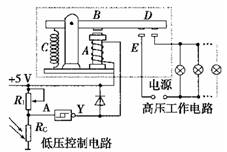 解析 天较亮时,光敏电阻RG阻值较小,斯密特触发器输入端A电势较低,则输出端Y输出高电平,线圈中无电流,工作电路不通.天较暗时,光敏电阻RG电阻增大,斯密特触发器输入端A电势升高,当升高到一定值,输出端Y由高电平突然跳到低电平,有电流通过线圈A,电磁继电器工作,接通工作电路,使照明灯自动开启. 天明后,RG阻值减小,斯密特触发器输入端A电势逐渐降低,降到一定值,输出端Y突然由低电平跳到高电平,则线圈A不再有电流,电磁继电器自动切断工作电路的电源,照明灯熄灭. 答案 见解析