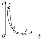 A.当过一段时间可以发现上面瓶中的气体也变成了淡红棕色 B.二氧化氮由于密度较大,不会跑到上面的瓶中,所以上面瓶不会出现淡红棕色 C.上面的空气由于重力作用会到下面的瓶中,于是将下面瓶中的二氧化氮排出了一小部分,所以会发现上面瓶中的瓶口处显淡红棕色,但在瓶底处不会出现淡红棕色 D.由于气体分子在运动着,所以上面的空气会到下面的瓶中,下面的二氧化氮也会自发地运动到上面的瓶中,所以最后上、下两瓶气体的颜色变得均匀一致 解析 抽去玻璃板后,空气与二氧化氮两种气体接触,由于分子的运动,过一段时间空气、二氧化氮气体会均匀分布在上下两广口瓶当中,颜色均匀一致,都呈淡红棕色,A、D对,B、C错. 答案 AD 四、分子之间的作用力 【例4】 设有一分子位于如图所示的坐标系原点O处不动,另一分子可位于x轴上不同位置处,图中纵坐标表示这两个分子间作用力的大小,两条曲线分别表示斥力和引力的大小随两分子间距离变化的关系,e为两曲线的交点,则( )