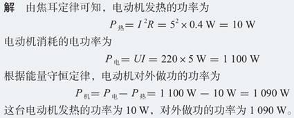 任务二:纯电阻电路和非纯电阻电路 [例2]一台电动机,线圈的电阻是0.4Ω,当它两端所加的电压为220V时,通过的电流 为5A。这台电动机发热的功率与对外做功的功率各是多少?